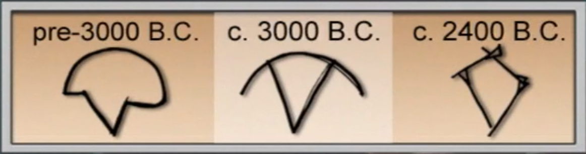 Previamente, un mismo símbolo podía significar cosas distintas que se pronunciaban de manera similar (homofonos). Además los símbolos eran gráficamente descriptivos y eventualmente se fueron simplificando con otros pictogramas más abstractos. Del mismo modo, se fue perfeccionando el modo de escribir, que inicialmentese hacía en celdas dispuestas verticalmente, para hacerlo horizontalmente de izquierda a derecha (3200 BC) pero con los símbolos rotados 90º. Por tanto, para la lectura había que girar la tablilla e interpretar los simbolos verticalmente y de derecha a izquierda.